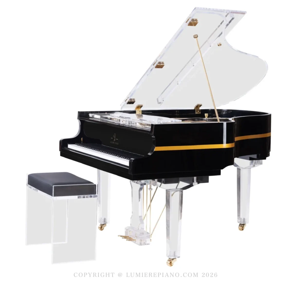At its core, Lumiere Classic remains a serious instrument: a spruce soundboard and keyboard, German Abel hammers, Rosslau strings, and precision-crafted Plexiglas acrylic components ensure both beauty and musical integrity. With Lumiere Classic, refined design and exceptional craftsmanship come together in a piano that makes elegance more attainable than ever.